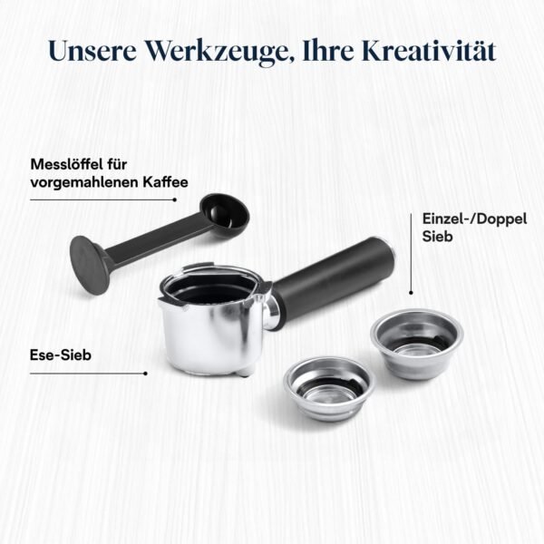 Flexible Zubereitung: Siebträger-Einsätze für 1 oder 2 Tassen sowie E.S.E.-Pads geeignet.